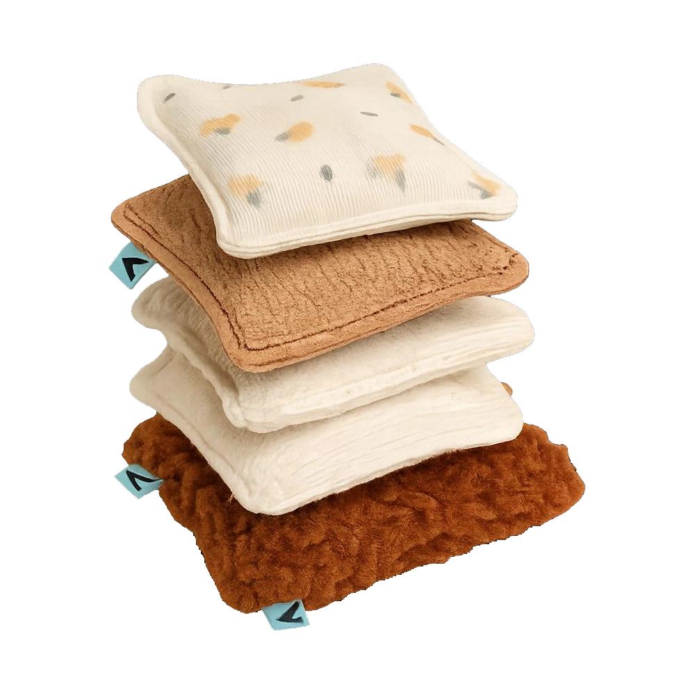 Onze sensorische pittenzakjes zijn een uitnodiging tot ontdekken, voelen en vrij spelen. Elke pittenzak is uniek, de buitenstof kan glad, ribbelig of zacht zijn.